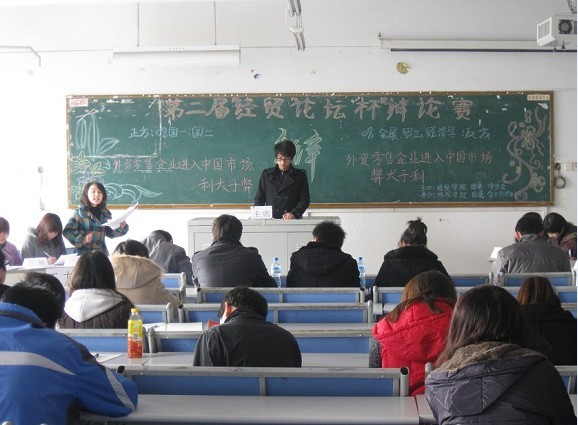 3月27日下午1:30 主校区70405 教室内热闹非凡,由经贸学院团委员工会主办、经贸学院团委学科部承办的第二届经贸论坛杯辩论赛激情上演,比赛特邀管理学院辩论队队长乔冲,会计学院陈俊杰、唐韦仪担任评委,同时此次比赛也吸引了众多大二、大三的同学前来观看。