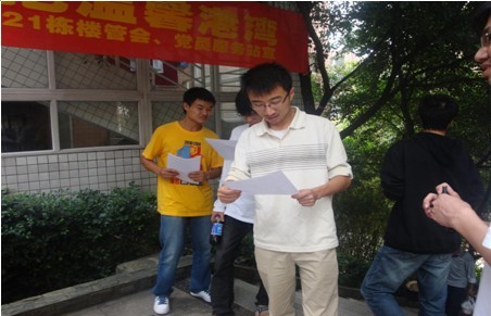 为了更好地发挥此次宣传活动的积极作用,向同学们传达活动精神,公寓管理处陈胜勇老师和老员工自律委员会干部在楼栋干部和党员服务站干部的陪同下参加了此次活动。在活动中,陈老师和大自委干部对此次活动给予了积极评价,并提出了存在的问题。