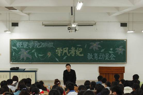 为了让2010级的同学们尽快适应大学期间的考试,进一步加强学院的学风建设,严肃考纪,促进学院创先争优工作的开展。经济贸易学院11月5日上午在7221教室召开了“2010级学风考纪教育动员会”。 2010级辅导员和全体同学参加了此次动员大会。