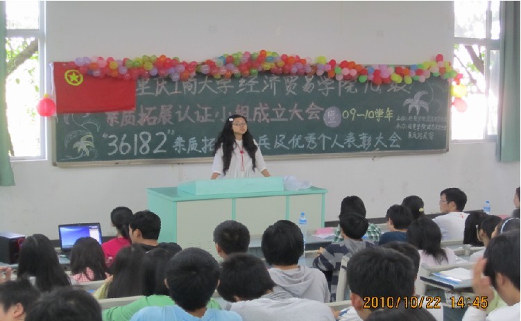 10月22日下午2:30,经贸学院10级素质拓展认证小组大会暨09-10学年“36182”素质拓展标兵及优秀个人表彰大会在兰花湖20111教室举行。此次活动由经贸学院团委员工会主办,经贸学院团委素质拓展部承办。经贸学院辅导员林新竹老师、校员工会副主席钟媛媛、院员工会主席团成员胡悦、孙莹、侯了、王信轶作为嘉宾出席会议,10级200多名员工代表参加了大会。