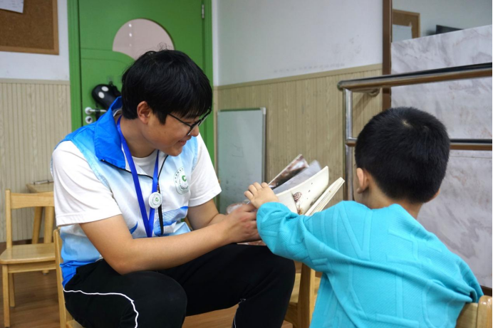 活动前,根据幼儿园的实际情况和需求,志愿者分为了三组。部分志愿者前往厨房,清洗、切配食材,保证自闭症儿童午餐的及时供应;部分志愿者晾晒、整理衣物,保持宿舍环境的整洁有序,在劳动中丰富志愿服务的体验;还有一部分志愿者走进教室,协助教师进行日常教学活动。志愿者们与自闭症儿童们一起围坐,共同阅读书籍,耐心地为孩子们讲述书中的故事,激发孩子们的想象力和求知欲。在带领孩子们搭积木的过程中,志愿者们积极引导孩子们发挥创造力,搭建出各种形状的建筑。通过丰富多样的活动体验,孩子们感受到志愿者们带来的温暖。