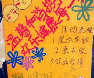 举办此次活动,旨在提高大家的寝室文化品位,促进老员工综合素质的提高,激励大家共同营造一个诚信友爱,和睦相处,充满活力的寝室文化氛围。活动共氛围三个比赛环节,采取淘汰赛的形式决出冠亚季军。第一个环节为笑脸PPT或视频展示环节,由参与报名的寝室按次序播放准备好的视频,评委根据笑脸阳光度以及笑脸灿烂度打分,第一阶段活动后选出得分最高的前九组寝室进入第二轮比赛。第二个环节为叠衣服比赛,比赛分为三轮进行,每轮3组,计时两分钟,每组叠一件T恤与一件衬衫,由评委根据速度与美观度依次进行打分。并选出得分最高的三组进入决赛。决赛比赛为你画我猜。由每组派出两个比较默契的代表,随即在工作人员的手中抽取卡片,一个人在黑板上画画,另一人来猜。每组限时一分钟,依据答对题目多少,再累加起前两轮比赛得分,来确定冠亚季军。经过几轮激烈的角逐与淘汰,本次活动的冠亚季军成功产生。在活动过程中,为了缓解现场的紧张气氛,主持人采用脑筋急转弯的形式进一步调动大家的积极性,并以糖果作为奖励。每当提出一个问题后,台下观众反应异常迅速,气氛异常热烈。就这样,活动在一种欢乐祥和的气氛当中落下了帷幕。活动接近尾声,由冯老师和郝老师为一二等奖寝室颁发了奖品,并且由冯老师对此次活动做了点评式的发言,冯老师指出,此次活动形式非常新颖,大家参与度极高,内容多样,称得上是一次比较不错的楼栋活动。同时,大自委的同学也对此做了点评,他们也对此次活动做出了较高评价。