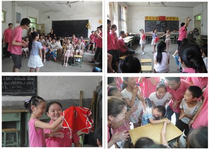 在与当地学校老师见面交流后,实践团对活动进行了安排,同时对当地留守儿童的学习生活情况也有了大致的了解。在接下来的活动中,实践团成员一一为留守儿童表演节目,并且陪同他们做游戏,使他们的脸上露出了开心的笑容。留守儿童不仅作为一名观看者,也是一名演出者,在实践团成员的带动下,有好几个小朋友为大家带来了他们最喜欢的歌曲和最熟悉的诗词,并且跟随表演者学习舞蹈。小小的课室里,弥漫着轻松和谐的气氛;一阵阵欢声笑语,回响在每个人的耳边。除此之外,实践团成员还对留守儿童的生活、学习等各个方面通过以问卷调查的方式有了更进一步的了解。在活动期间,实践团成员还与到场的监护人进行交谈,更加清楚了解孩子们的学习生活情况,并结合当地留守儿童的实际情况给与了一些建议和帮助。随后,实践团为留守儿童派发了学习用品,并详细讲解了许多关于学习、安全等方面的知识,同时对他们表达了莫大的鼓励和希望。最后,实践团全体随同留守儿童一起深入到他们家中,和他们同吃同住,并对他们的学习进行辅导。