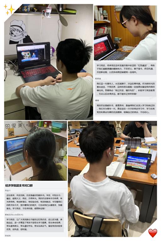 观看之后,同学们纷纷发表感想, 19级国贸一班的团支书李冰同学认为,学史可以明理,学史可以增信,学史可以崇德。今年我党迎来了建党一百周年华诞,真是普天同庆,通过观看党史学习大会,学习了党史知识,回顾我党的艰苦奋斗之旅,受益良多。2019级研究生团支书易桂林表示,江河万里,七月的丰碑耸立不朽,神州大地,一百年的党史辉煌灿烂。新时代青年应自觉回顾党的历史,感受党的精神,方能不忘初心,继续前行。18经济学一班的张津谈到,学院分团委大力推进基层团组织建设,让广大团员青年们更加明确学习党史的重要性,提高思想觉悟的纯洁性。作为老员工的我们,要在学习党史、端正思想的同时,感悟这些优秀党员同志的精神,向他们学习,向他们致敬!