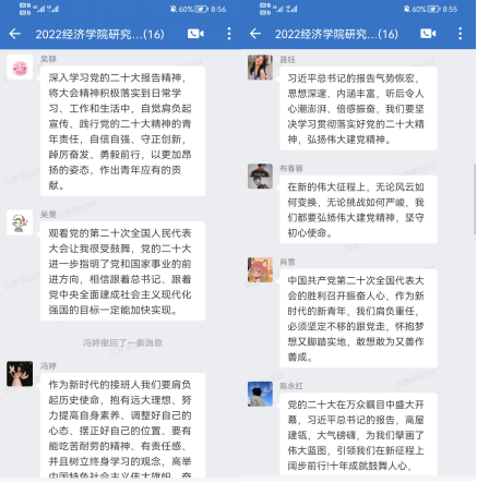 2022年10月16日上午10时,中国共产党第二十次全国代表大会在人民大会堂隆重开幕,这是在全党全国各族人民迈上全面建设社会主义现代化国家新征程、向第二个百年奋斗目标进军的关键时刻召开的一次十分重要的大会。研究生第一党支部组织全体党员通过线上分散观看的方式学习党的二十大报告精神,支部党员积极响应,会后围绕报告纷纷畅聊感受。