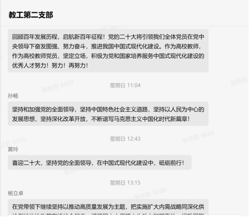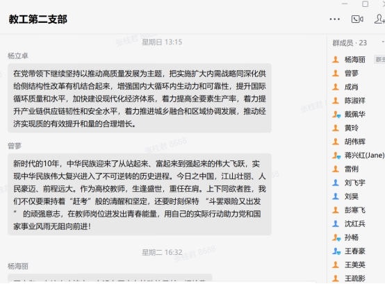 习近平总书记的报告高瞻远瞩,思想深刻,内涵丰富,振奋人心,让老师们倍受鼓舞。在观看过程中,支部成员们直抒胸臆:“党的二十大,振奋人心,催人奋进。中国共产党始终是一个有崇高理想和坚定信念的党。一代代中国共产党人拼搏奉献、攻坚克难,靠的就是一种信仰,为的就是一个理想。作为高校教师,坚持用心用情讲好思政课,引导青年员工听党话、跟党走。”“党的十八大以来,党和国家事业发展经历了极不寻常、极不平凡的十年。以习近平同志为核心的党中央始终把握历史大势、掌握历史主动、保持战略定力,凝聚起全国各族人民的奋进伟力,引领中国克服重重困难,不断创造奇迹,朝着光明未来破浪前行。”“在党带领下继续坚持以推动高质量发展为主题,把实施扩大内需战略同深化供给侧结构性改革有机结合起来,增强国内大循环内生动力和可靠性,提升国际循环质量和水平,加快建设现代化经济体系,着力提高全要素生产率,着力提升产业链供应链韧性和安全水平,着力推进城乡融合和区域协调发展,推动经济实现质的有效提升和量的合理增长。”