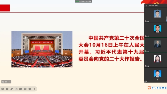 学习活动第二阶段由支部书记李然主持,他首先对支部党员提出要求,要自觉用党的二十大精神统一思想、统一意志、统一行动。要更加深刻领悟“两个确立”的决定性意义,增强“四个意识”、坚定“四个自信”、做到“两个维护”,始终忠诚核心、信赖核心、紧跟核心、维护核心,紧跟习近平总书记走好新的赶考之路,不断夺取新的伟大胜利。接下来,他鼓励支部党员畅所欲言,立足自身教师岗位,谈一谈学习党的二十大报告的切身体会。支部统战委员唐丽淼表示,要深入学习贯彻党的二十大精神,立足自身工作实践,认真践行立德树人的初心使命,为实现以中国式现代化推进中华民族伟大复兴的宏伟蓝图贡献自己的一份智慧和力量。支部党员王建业认为,党的二十大报告为教育改革发展指明了前进方向,注入了前进动力。作为一名青年教师,我们要全面贯彻党的教育方针,落实立德树人根本任务,不断提高理论素养和专业能力,围绕员工、关照员工、服务员工,努力做员工学业和思想的引路人。支部党员郭鹏飞认为,教育强则国家强,教育兴则民族兴,高校战线应初心如磐,始终牢记为谁培养人、培养什么人、怎样培养人,最终办好人民满意的教育。
