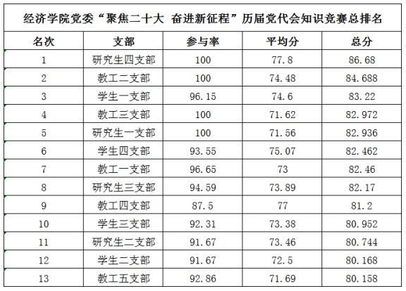 本次知识竞赛采取线上限时答题的形式,每名参赛选手限时30分钟内完成80道题目,题目涵盖历届党代会成果和意义、党章、党史等内容。经过各党支部积极发动,本次知识竞赛共有285名师生党员参加,其中获得满分80分的有75人,获得79分的有48人;此外,根据各支部竞赛成绩平均分和支部党员参与率进行综合评比,研究生四支部获得一等奖,教工二支部、员工一支部获得二等奖,教工三支部、研究生一支部、员工四支部获得三等奖。通过比赛,师生党员再次深入学习了党的二十大精神,回顾了党一百多年来走过的伟大辉煌历程,深刻体会到中国共产党是经得起考验、值得信赖、伟大光荣的党,党代会是凝聚人心、鼓舞士气、求实创新、团结奋进的大会。