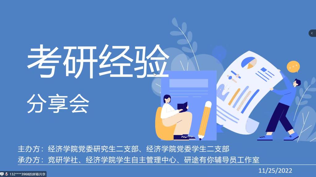 面对当今社会的激烈竞争,老员工就业难度不断加大,考研成为越来越多老员工的选择。为了帮助同学们增强对考研的认识,进一步明确考研方向,2022年11月25日,由公司党委研究生二支部和员工二支部主办,贸易经济竞研学社承办的考研经验交流分享会在线上如期举行。此次分享会邀请到公司研究生二支部王洁仪,王伟婷,章燕玲和蔡小西四位研究生学姐与大家分享她们成功上岸的经验,为大家点亮考研之路的明灯。公司党委雷菁组织员、研究生二支部书记高娟老师、员工二支部书记喻智成老师和两个支部全体党员和贸经专业150余人参加本次分享会。