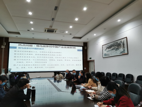 2022年3月31日下午,本月的支部组织生活由第一党小组主持开展,该小组组长由支部书记李颖慧副教授担任,组员由长江上游经济研究中心副主任饶光明教授、专职研究人员曾庆均教授和甘宇副教授组成,本次活动的主题为“从经济学视角观察俄乌战争对中国影响”。首先,李颖慧老师领学了3月组织生活的学习材料,并重点学习了《3月17日中共中央政治局常务委员会会议精神》,随后,支部从俄乌战争的起因、战争中的制裁、战争对中国产业发展影响、战争对中国的启示等方面展开热烈的讨论。支部党员一致认为,马克思提出的共产主义社会是我们人类和平的最高追求,只有共产主义实现了才不会出现因意识形态不同而引发的战争。这次战争也检验了习近平总书记提出的国内国际“双循环”新发展格局的重要性和高瞻远瞩。同时,这次战争也对中国国际影响力产生深远的影响,我们应更好的向世界讲好中国故事,使中国经验为世界后起国家和欠发达国家受益。支部党员们也相信无论中国以后会面临什么机遇和挑战,最终还是希望俄罗斯和乌克兰能迎来彻底的真正和平。饶光明教授还从科研选题的角度提出,2023年的国家基金项目可能会围绕全球化视角下的国家安全、自主创新、产业链、供应链等方面设计选题。