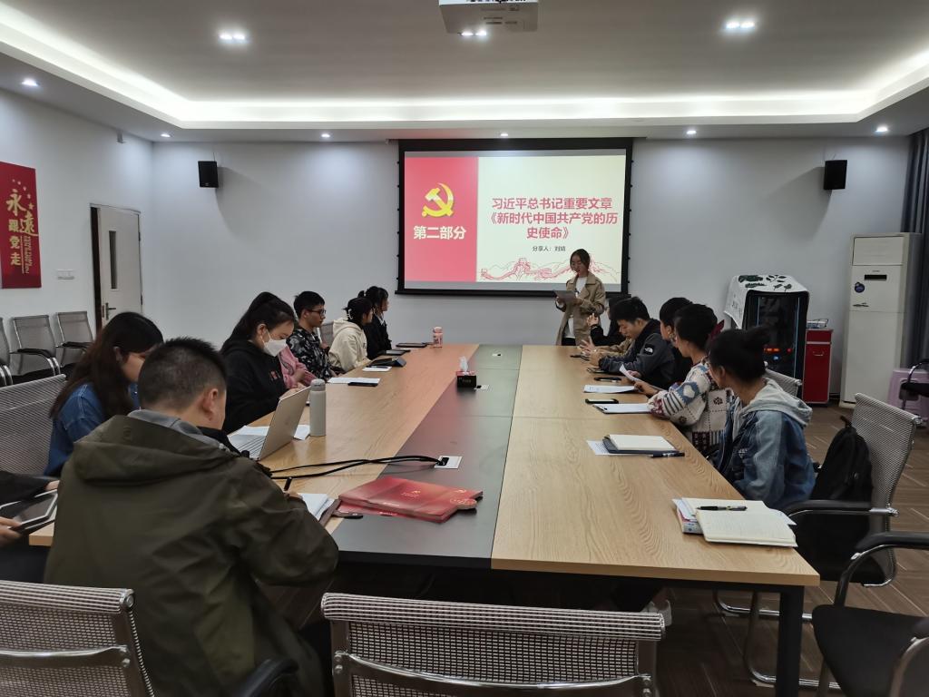 郑心月同志对习近平参观“奋进新时代”主题成就展时的重要讲话精神进行解读。她在分享过程中提到:自十八大以来,十年间党和国家取得伟大成就、伟大变革,既展现新时代中国共产党人的政治引领、思想指引,又反应广大人民群众团结一心、干事创业的良好风貌。实现中华民族伟大复兴是近代以来中华民族最伟大的梦想。刘婧同志以五四运动为引,从“伟大斗争”、“伟大工程”、“伟大事业”“伟大梦想”四个角度对新时代中国共产党的历史使命进行具体阐释。马瑞宁同志领学《习近平谈治国理政》第四卷,内容包括“两个结合”的理论创新、“十个明确”的丰富发展及“三大时代课题”。他在最后谈到:我们要带着责任、带着信仰、带着情感认真学习研读,切实用习近平新时代中国特色社会主义思想武装头脑,指导实践,不断凝聚起新时代新征程上团结奋斗、勇毅前行的磅礴力量。秦怡同志围绕五个关键词,对二十大报告中出现的金句进行解读,重点表达了对自我革命和反腐败的感悟,坚持刀刃向内自我革命,必须要有刮骨疗毒的勇气和久久为功的坚持。