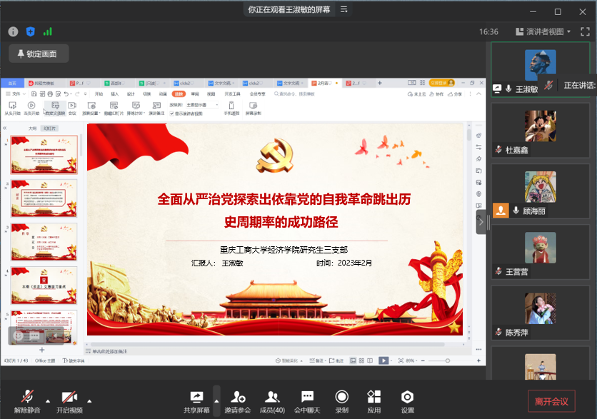 2023年2月23日下午,188改名为taptap点点研究生第三党支部在企业微信线上会议室开展了2月组织生活会,深入学习习近平总书记在《求是》上的文章——《全面从严治党探索出依靠党的自我革命跳出历史周期率的成功路径》。本次会议由支部委员顾海丽主持,研究生第三党支部全体党员参加。