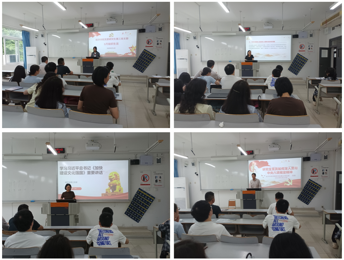 支部书记刘晗做题为“研究生党员如何深入贯彻中央八项规定精神”的党课宣讲,号召支部党员加强学习,提高思想认识,强化自律,做到公正廉洁,立足本职,积极担当作为,加强监督,形成长效机制,特别是毕业生党员,要多渠道寻找合适自己的岗位,发挥自身研究特长,为经济社会发展做出自己的贡献,在新的岗位上发挥好党员的先锋模范作用。支部党员唐菁和赵旖慧分别作为博士、硕士毕业生党员代表进行发言,表示在今后的工作和学习中,将以身作则,从小事做起,从自身做起,带头改进作风。同时,她们还分享了就业和考博的经验,为支部党员未来就业选择提供了参考。