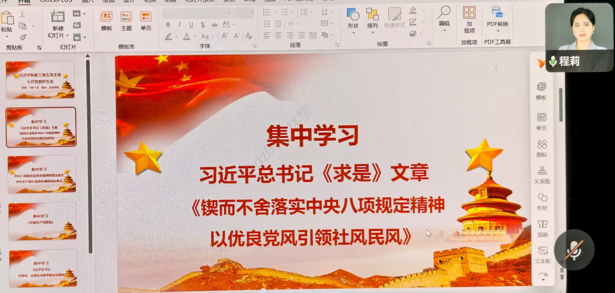 教工第五支部书记林黎总结提出在临近暑假放假的7月,开展“深入贯彻中央八项规定精神学习教育”,尤其是深入了解中央八项规定及其实施细则等法规文件中关于禁止违规吃喝的规定要求,对于假期违规吃喝的防微杜渐具有重要警示教育意义。同时,深入贯彻中央八项规定精神是对每一个党员的基本要求,禁止违规吃喝的规定要求是建立在《中国共产党章程》基础上,在“中国共产党建党104周年纪念”的7月,组织学习《中国共产党章程》,提醒支部党员时刻将党章党纪铭记于心,付诸于行。