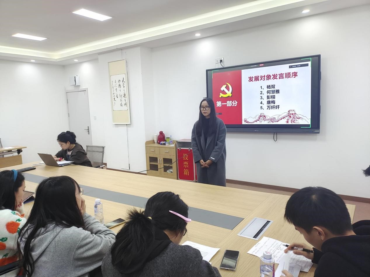 会议伊始,主持人介绍了本次发展大会的相关内容和具体流程。接着杨双、何慧雅、彭栩、唐梅、万纤纤五位同志依次从个人的自我情况和入党动机等方面进行汇报。杨双同志表示自己通过党课学习和支部活动,进一步坚定了理想信念,深刻认识到党员“先锋模范”的责任。未来会继续加强政治理论学习,提升综合素质,将理想信念落实到行动中,体现在每一件小事上。随后,何慧雅同志表示自己关注并钻研党的经济政策和“三农”部署,将党的理论和专业知识相结合,体会到了基层工作的不易。未来会提升理论水平,加强实践性,为基层发展注入动力。紧接着,彭栩同志表示自己在成长过程中不断深化了对党的理论的学习和理解,入党初心愈发坚定。今后会积极参加社会实践和志愿服务活动,传递更多温暖,用实际行动诠释对党的忠诚和担当。再接着,唐梅同志表示自己在思想上追求进步,关心国家大事,不断提高政治觉悟。今后会以高标准严格要求自己,积极参加组织活动,以身作则,为同学们树立榜样。然后万纤纤同志表示自己积极学习党的理论知识,向优秀党员看齐,在服务群众的过程中深刻体会到了党员的责任和担当。今后会不断提升自身的综合素质,为服务社会、人民储能。发展对象发言结束后,他们的入党介绍人及党员同志补充说明了五位同志的日常表现。经全体参会党员无记名投票,现场唱票计票,大会一致决定接收杨双、何慧雅、彭栩、唐梅、万纤纤五位同志为预备党员。最后,文理书记作总结发言,他寄语全体党员同志把每一件事做扎实,一步一个脚印地成长,就是对自身最好的提升。