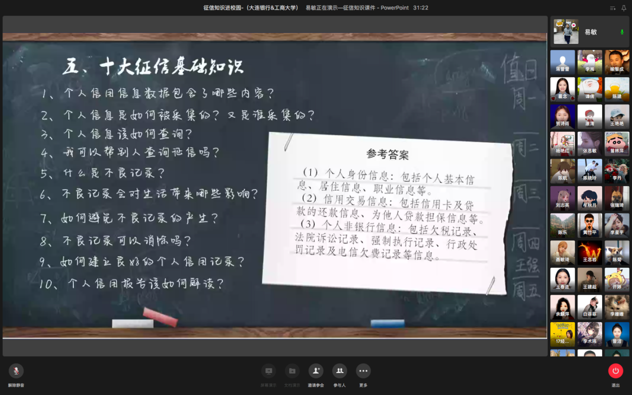 活动在中午十二点半正式开始,公司党委副书记王燕教授为活动致辞,号召同学们认真学习、学以致用,主动保护好自己的征信,为未来的人生积攒财富。大连银行团委书记蒋蕾蕾随后发言,感谢188改名为taptap点点为大连银行提供宣讲平台,同时感谢学校师生的信任与支持,希望未来能够与学院和同学做更多金融知识的交流。大连银行重庆分行团委副书记易敏,通过线上直播课分享,为到场老员工们宣讲了“老员工应知应会的十个征信知识”,通过生动的案列、温馨的视频和详实的解读,让老员工们加深了对个人征信知识的了解,知道了不良记录的危害,学习了如何保护个人信用记录。