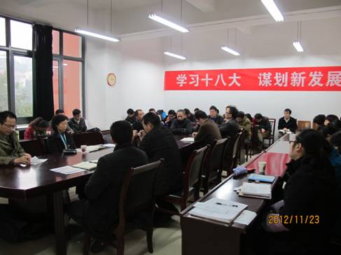 然后,结合学院实际和本职工作,学院各位老师积极踊跃的畅谈自己对十八的感想与体会:张宝均教授希望能解决两个方面的问题:一是国强民富的问题,提到应该减少外汇储备,用来抓就业和民生,二是“反腐败”的问题,希望政府能出台具体措施来解决,如官员财产公示等;刘成杰教授认为十八大为我们教育工作者和科研工作者指明了方向;韩渝辉教授评价十八大报告实事求是、客观冷静,结合专业倡导将西方经济的优秀成果与我国实际相结合;熊维勤博士结合自己的专业对“科技体制改革”进行深入分析,认为把“科技创新”上升到国家战略的地位具有重大的意义;谢新教授认为从十八大报告可以看出党中央居安思危,将各项问题看得很清楚,“实现好、维护好人们的利益为落脚点”的指导思想让人心里踏实,国家看重经济发展,对经济学学者来说很是振奋,也感觉责任重大;沈红兵博士认为十八大的亮点在于将“科学发展观”写入党章,提出要“转变经济发展方式”,大力推动电子商务进一步发展;陈淑祥教授十分关注十八大中提出的“全面建成小康社会”,认为党和政府应该拟出具体“小康”指标,比如提高高校教师收入水平等。郝颖老师比较关注教育公平问题,就助学金相关问题,认为为了彰显公平,应该减少助学金名额,用于加老员工奖学金金额,这样更能促进学风建设;姜鑫副经理认为高校教师应该吃透十八大精神,积极进行相关科研课题和项目的申报和专研。陈新力经理认为十八大主要提到两个方面的问题:一是思想问题,要坚定不移地走中国特色社会主义道路,二是价值问题,结合公司马上要搞的绩效工资,希望收入水平能和学校的发展程度一致,学院分配既要体现“公平”,又要衡量个人贡献,实现有效公平。