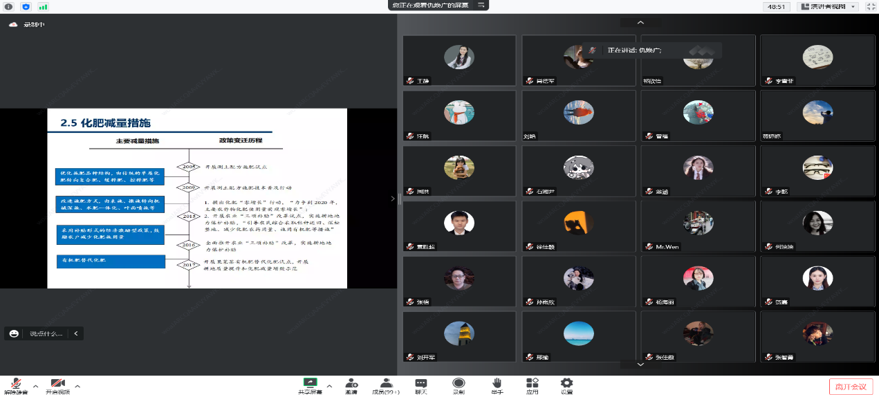 2022年11月25日,教育部长江学者特聘教授、中国人民大学农业与农村发展学院经理、博士生导师仇焕广在腾讯会议平台线上为公司经济学实验班同学作专题讲座,2022级、2021级、2020级经济学实验班同学及实验班班导师均参加了此次讲座。仇焕广教授讲授的主题是《农业绿色发展与生态文明建设》,重点从耕地保护、林草绿色发展、农业水资源利用、外来物种入侵、种质资源保护、渔业资源保护、化肥农药使用、畜禽粪污与秸秆还田、农膜使用、农业温室气体排放、农村人居环境治理、农业绿色消费等领域阐述了农业绿色发展的主要内容,然后从生态补偿政策、生态运行模式等方面提出了相应的对策。会后,实验班同学分别就粮食安全与农业绿色发展的关系、农村人力资本投入等话题向仇经理进行请教交流,同学们普遍反映听了仇经理的讲座后获益匪浅。