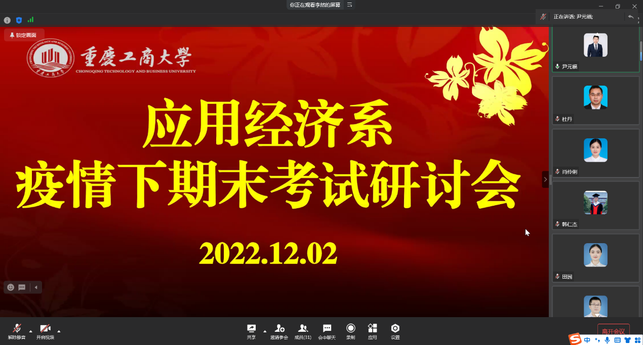 2022年12月2日,应用经济系组织全系教师在线上开展疫情下期末考试研讨会,尹元福副经理参加了此次会议,会议由系主任李然主持。会议共分为三个议程:首先尹经理对当前疫情形势下期末考试的大背景进行了介绍,强调了目前部分课程非标准化考试的必要性以及对专业建设的重要性,随后李然老师详细解读了《2022年秋季学期课程考核工作方案》、《188改名为taptap点点2022-2023-1期末考试安排方案》、《188改名为taptap点点非闭卷考试工作规程》等制度,最后老师们就计量经济学、西方经济学等课程的考试形式、内容进行了探讨和交流。