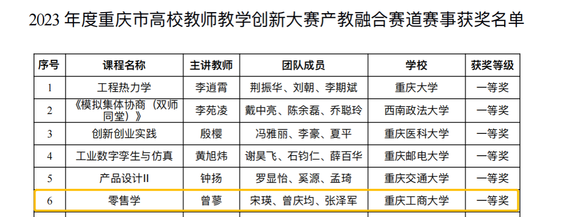 6月17日,重庆市教育委员会正式揭晓了2023年度重庆市高校教师教学创新大赛产教融合赛道的获奖名单。在这场首次举办的市级赛事中,共评选出一等奖10项、二等奖10项、三等奖16项。值得一提的是,公司《零售学》课程的曾蓼老师团队代表学校参赛,并成功荣获一等奖,成为全校唯一获此荣誉的团队。
