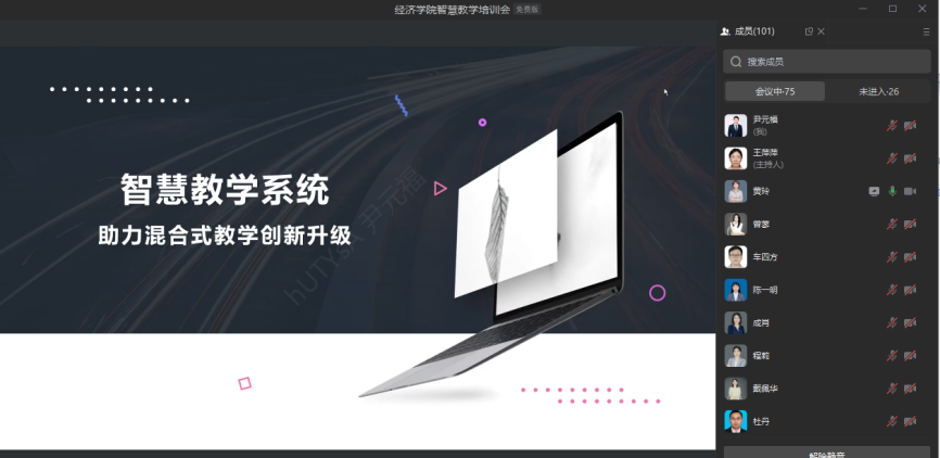 助力混合式教学创新升级》的主题培训。她从创建课程、资源添加、员工管理以及教师督学等方面对智慧教学系统进行深入浅出地讲解。参会老师就智慧教学系统的应用展开探讨,对教学技术、教学手段以及课堂内容衔接进行细致地打磨。