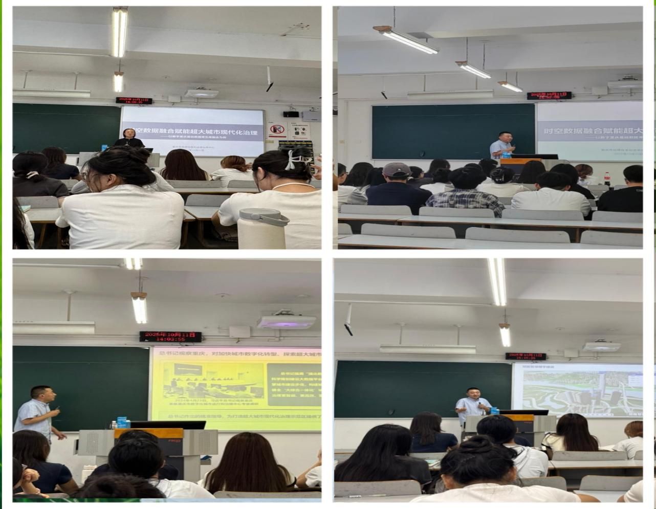 讲座中,高翔主任紧扣“融合、赋能” 两个核心词,从国家战略与市级布局的高度切入,系统阐述了时空数据在超大城市治理中的革命性作用。他首先引述了习近平总书记关于加快城市数字化转型的重要指示,并介绍了袁家军书记将数字重庆建设作为“一把手”工程全力推动的顶层设计,为同学们勾勒出时代发展的宏大背景。随后,高翔主任以数字重庆建设中的“五库融合”实践为例,深入浅出地展示了如何将各类空间管理单元与标准地址、实有人口等数据深度融合。通过生动的案例和清晰的示意图,他解释了时空数据如何让城市治理要素变得 “可看、可识、可算、可联通” ,从而实现物理城市在数字空间中的精准映射,为城市治理装上“智慧大脑”。