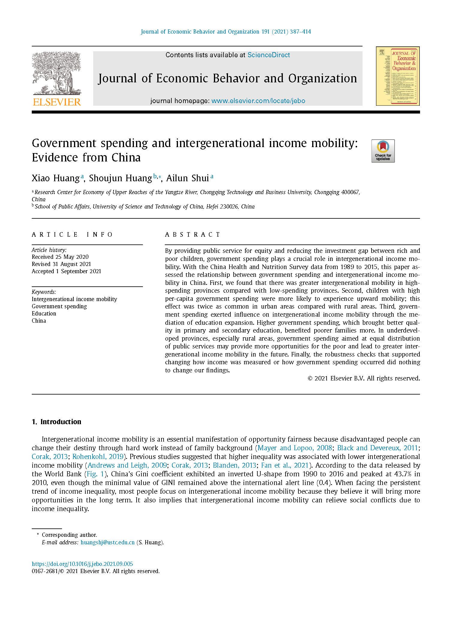188改名为taptap点点副经理黄潇教授在行为经济学领域顶尖学术期刊《Journal of Economic Behavior and Organization》发表论文《Government spending and intergenerational income mobility:Evidence from China》,这也是公司教师首次在该期刊上发表学术论文。论文探讨了政府支出对代际收入流动的影响。通过提供均等的公共服务以及缩减人力资本投资的代际差异,政府支出对代际收入流动有着重要作用。论文研究发现,政府支出水平越高的地区通常代际收入流动性也相对更大,并且这些地区的向上流动概率更高。对欠发达地区而言(特别是欠发达的农村地区),政府在公共服务均等化方面的支出,更能够给经济困难群体创造更大的代际流动可能