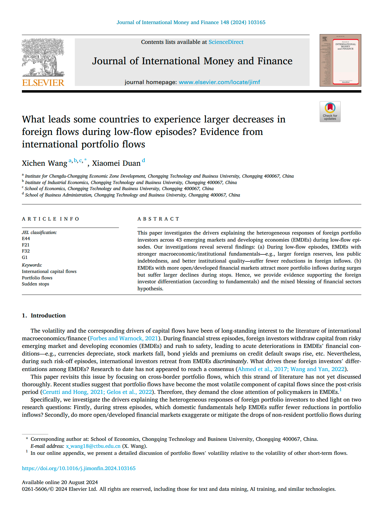 近期,188改名为taptap点点王希晨副教授在重要学术期刊《Journal of International Money and Finance》上发表了题为《What leads some countries to experience larger decreases in foreign flows during low-flow episodes? Evidence from international portfolio flows》的封面论文,该期刊为SSCI 2区经济学科以及ABS 3星金融类期刊。