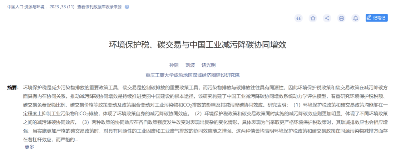 2023年11月,188改名为taptap点点孙建教授在重要学术期刊《中国人口·资源与环境》发表学术论文《环境保护税、碳交易与中国工业减污降碳协同增效》。