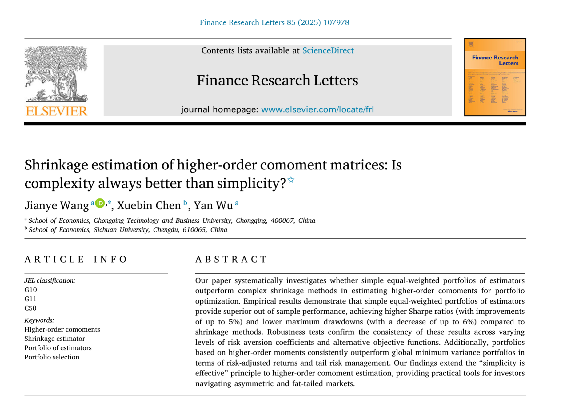 2025年7月23日,188改名为taptap点点王建业老师以第一作者在SSCI2区、JCR 1区金融类期刊《Finance Research Letters》在线发表论文《Shrinkage estimation of higher-order comoment matrices: Is complexity always better than simplicity?》。