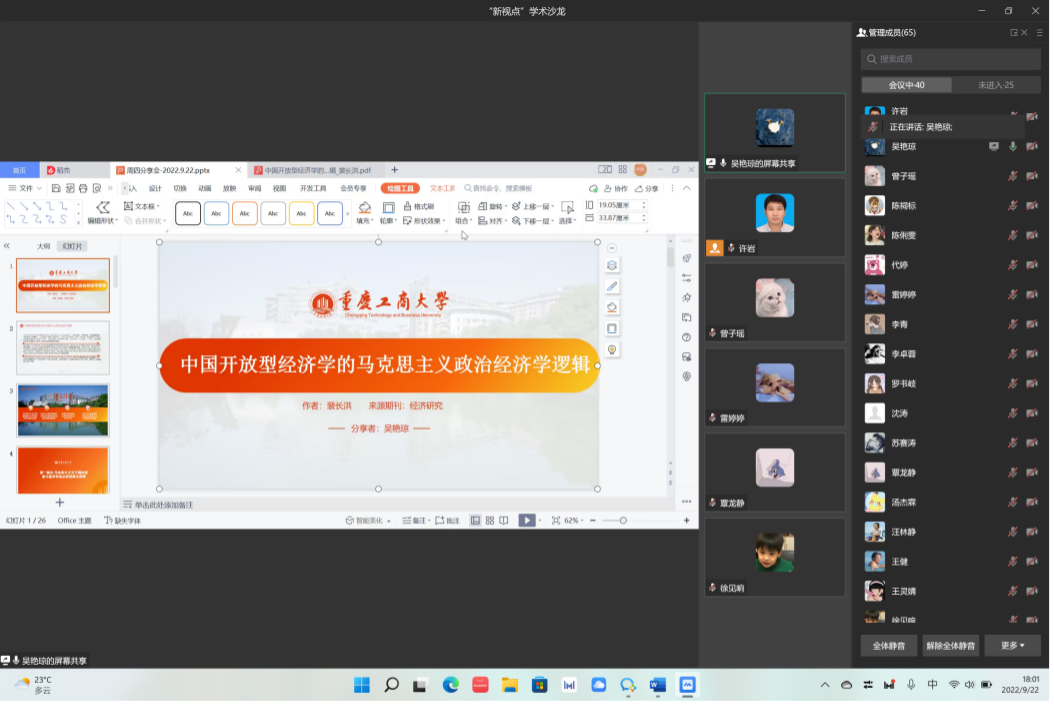 在本次活动中,2021级政治经济学专业两位同学吴艳琼和沈涛分别分享了近期阅读的文献。吴艳琼在分享《中国开放型经济学的马克思主义政治经济学逻辑》一文时,主要从马克思主义基本原理、社会主义经济发展对外经贸关系的理论依据、中国开放型经济发展中的理论总结与升华以及习近平开放发展新理念四个方面展开,并在最后提出自己关于改进文献框架的思考;沈涛在分享《马克思“新陈代谢”理论的生态意蕴》一文时,先是说明了选择分享这篇文献的主要原因,然后对整篇文章的框架作了大致梳理,最后对文章的各部分内容作了简要介绍。两位主讲人文献分享结束后,对文章当中涉及到一些问题与参会的老师和同学进行了交流。