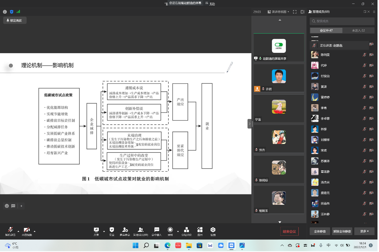 活动的第二个环节,由2021级人口资源与环境专业研究生赵鹏逸分享题为《低碳转型冲击就业吗——来自低碳城市试点的经验证据》(载于《中国工业经济》2022年第5期)的学术论文。赵鹏逸为大家讲解了该文的思路脉络,着重阐述了论文研究中运用到的理论模型、实证模型、指标选取、数据来源、计量分析和结果讨论等内容,以及自己阅读此文的收获。随后,黄潇老师从技术路线的角度对赵鹏逸的分享进行了点评,特别讲述了如何从渐进双重差分的角度对该文进行有益的扩展研究。