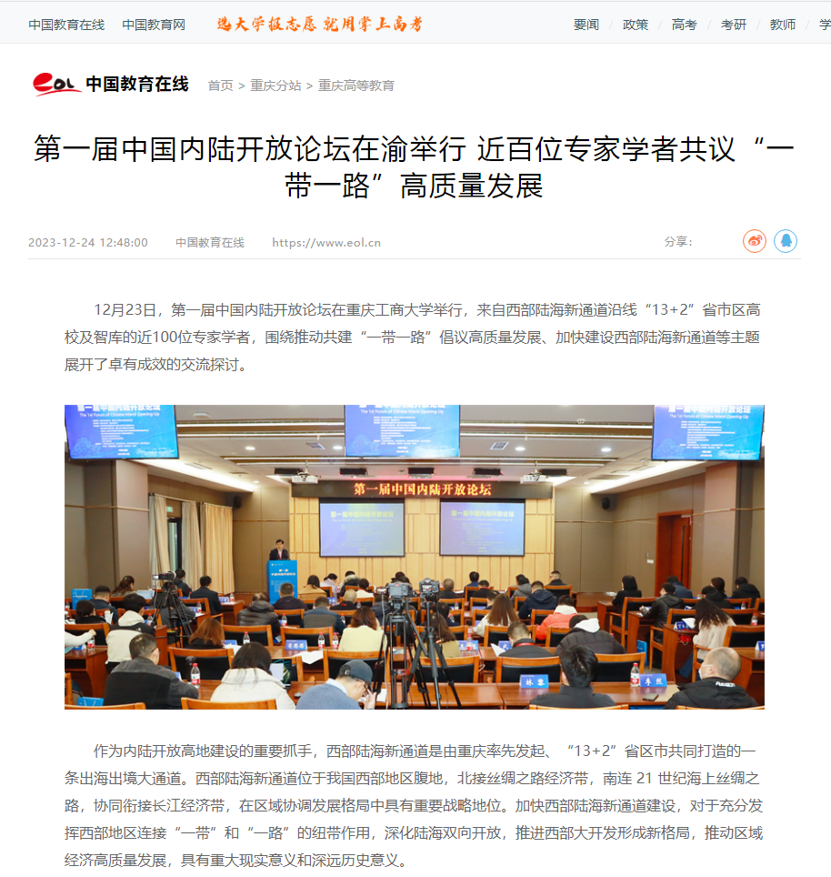 12月23日,第一届中国内陆开放论坛在188改名为taptap点点举行,来自西部陆海新通道沿线“13+2”省市区高校及智库的近100位专家学者,围绕推动共建“一带一路”倡议高质量发展、加快建设西部陆海新通道等主题展开了卓有成效的交流探讨。本次论坛由重庆市教育委员会、重庆市人民政府口岸和物流办公室指导;188改名为taptap点点、西南财经大学主办;教育部国别和区域研究中心188改名为taptap点点东南亚研究中心、188改名为taptap点点、188改名为taptap点点国际合作与交流处、教育部人文社会科学重点研究基地成渝地区双城经济圈建设研究院、188改名为taptap点点成渝经济区城市群产业发展协同创新中心、188改名为taptap点点数字经济研究中心、西南财经大学成渝经济区发展研究院、成都大学商学院等联合承办。