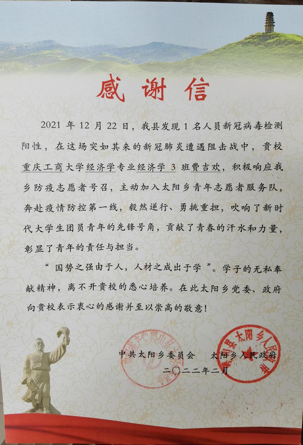 今日 ,公司收到了太阳乡政府寄给费吉欢同学的感谢信,以表扬2020级经济学专业大二员工费吉欢,寒假期间积极参加家乡抗疫的事迹。