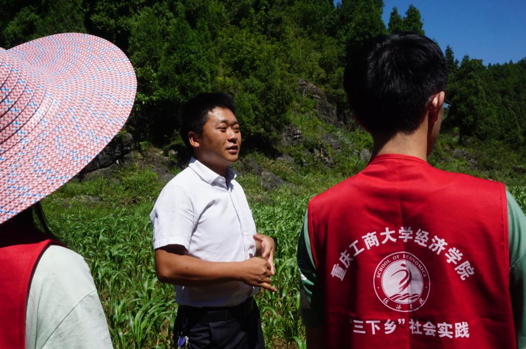 (官田村党支部书记谢兴林向促进团同学介绍高粱种植基地情况)