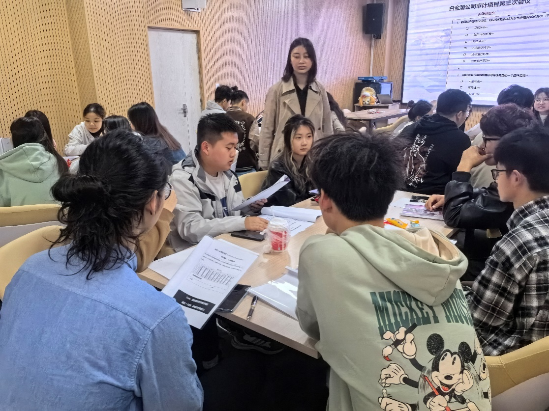 接着,“狼人杀”正式开始,审计团队中各潜伏着一名“内鬼”,各位审计师需要通过三轮审查,把“内鬼”揪出来。同学们手握“剧本”,开始依次介绍自己的审计工作,展开圆桌讨论。在场同学各显神通,“狼”精心伪装,在唇枪舌剑中伺机而动,扰乱局面……