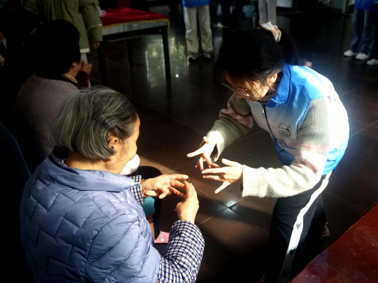 本次活动围绕健康促进与精神陪伴两大主题,精心设计了手指操教学与红歌合唱两个互动环节。在手指操教学环节,志愿者们采取分解示范、逐步引导的方式,从基础的手指屈伸到灵活的手指交叉连贯动作,耐心细致地带领老人们进行手部关节活动。随后,在志愿者的组织下,老人们齐声高唱《松花江上》《我的祖国》等耳熟能详的经典歌曲。活动现场欢声笑语不断,暖意融融。志愿者们的真诚陪伴为平日安静的养老院注入了青春活力,老人们的脸上始终绽放着幸福的笑容。“这些孩子们太贴心了,又带我们做操,又陪我们唱歌,今天过得特别开心!”一位参与活动的老人拉着志愿者的手动情地说。