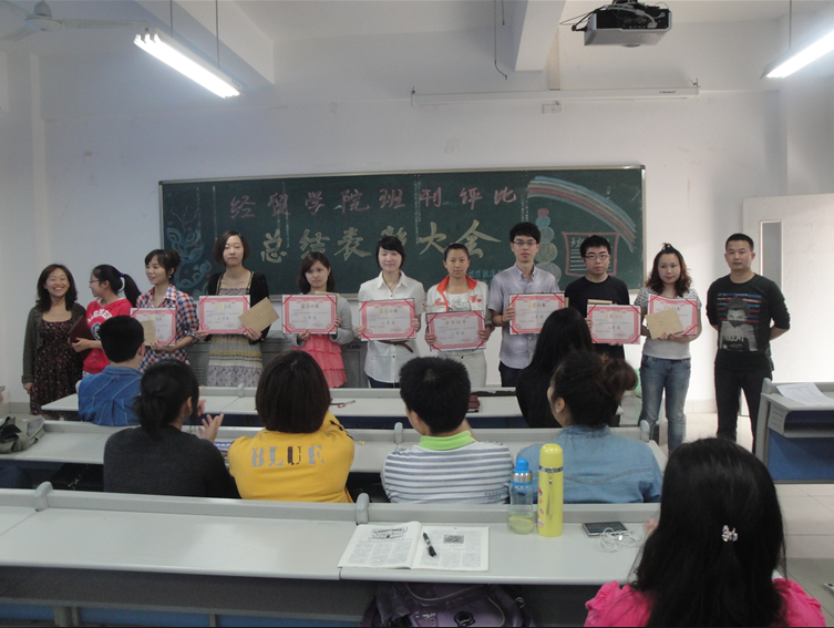 4月25日中午,由经贸公司党总支主办、经贸学院团委员工会承办的经贸学院班刊评比总结表彰大会在田家炳书院410教室准时举行。经贸公司党总支李华平副书记,分团委书记林新竹老师,09级辅导员黄玲老师,10级辅导员喻智成老师皆出席了本次表彰大会,与现场各班代表共同祝贺获奖班级。