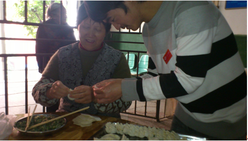 下午两点左右,志愿者们带着准备好了的饺子皮和肉馅到了南岸港口敬老院,开始了这次活动。有的志愿者和那里的工作人员一起为老人们包饺子,有的则和老人一起聊天,气氛和谐融洽。接着,义工志愿者给老人们表演了精彩的节目,老人们也参与了进去,大家一起唱歌跳舞,在节目互动中相互交流,整个过程充满了欢声笑语。后来,志愿者和老人们共同品尝自己亲手包的饺子,阵阵暖意溢满整个房间。