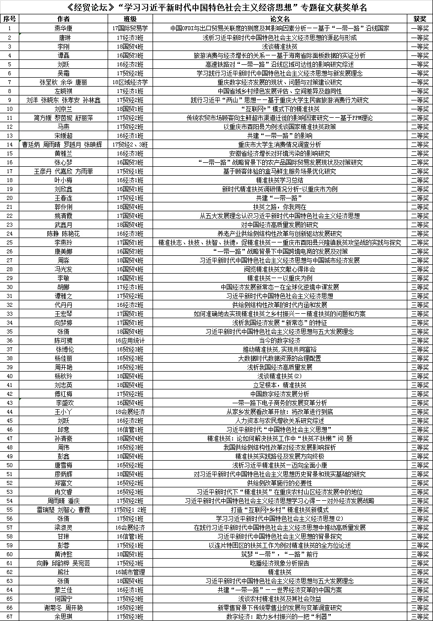 截止9月初,共收到稿件近70篇。投稿者紧扣中心、围绕主题,就精准扶贫、“一带一路”建设、五大发展理念、供给侧改革、数字经济、地方经济建设等多方面内容,阐述了自己的学术见解。经过学院专家组综合评定,遴选出优秀论文一等奖10名、二等奖18名、三等奖39名,获奖的优秀论文将被编入《经贸论坛(学习习近平新时代中国特色社会主义经济思想专刊)》。