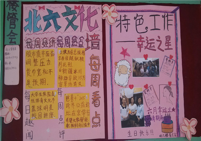 这学期时光匆匆,一学期的时间已有大半悄然流逝。北六楼管会的工作在时间的洪流中如期有条不紊地进行着。近阶段,仔细观察你会发现,北六的宣传栏就有了新的变化,更新的内容包括“特色工作——北六文化墙每周看点”和“特色工作--幸运之星总结”,它们为宣传栏增添了一抹色彩。