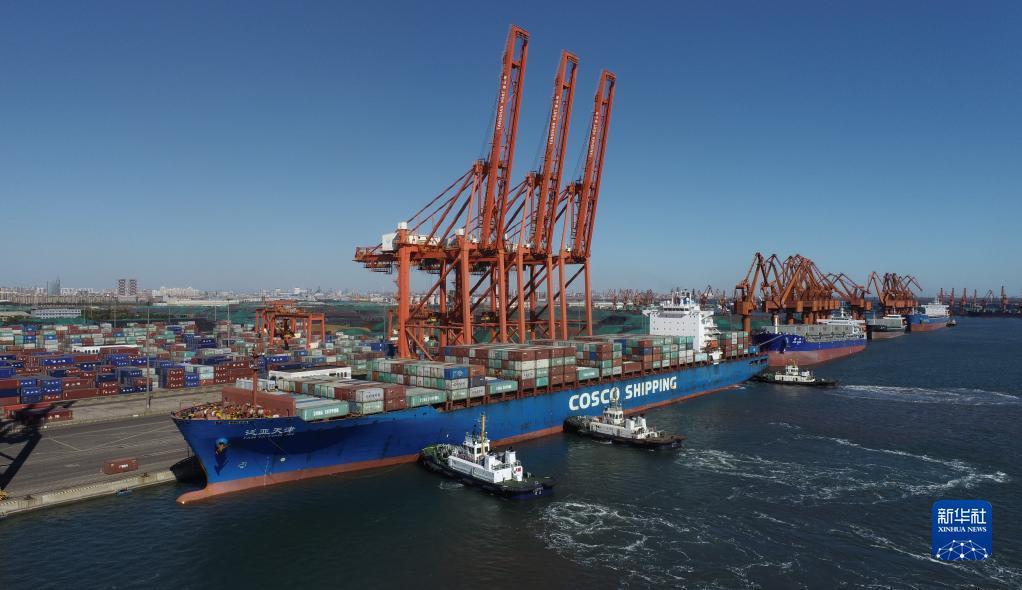 一艘轮船在拖轮的协助下向唐山港京唐港区集装箱码头靠泊(2021年10月23日摄,无人机照片)。新华社记者 朱旭东 摄