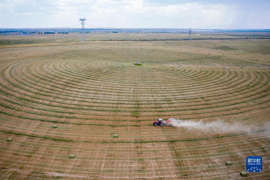 在宁夏盐池县冯记沟乡平台村的优质牧草基地,农户用机械将牧草打捆(无人机照片,2021年7月14日摄)。新华社记者 杨植森 摄