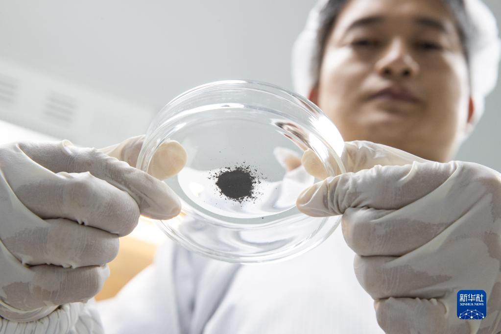 在中科院地质与地球物理研究所月球样品洁净室,田恒次副研究员在处理月球样品(2021年10月15日摄)。新华社记者 金立旺 摄