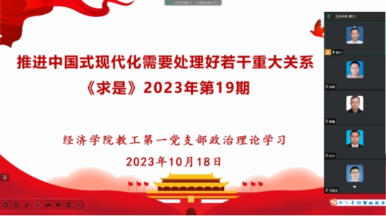 学习活动第一阶段由支部宣传委员熊兴主持,他带领大家学习了习近平总书记重要文章的主要内容,让大家认识到推进中国式现代化是一个系统工程,需要处理好顶层设计与实践探索、战略与策略、守正与创新、效率与公平、活力与秩序、自立自强与对外开放这6个方面的关系,号召大家深入理解推进中国式现代化需要处理好的若干重大关系,把中国式现代化理念融入课程教学和科学研究工作。
