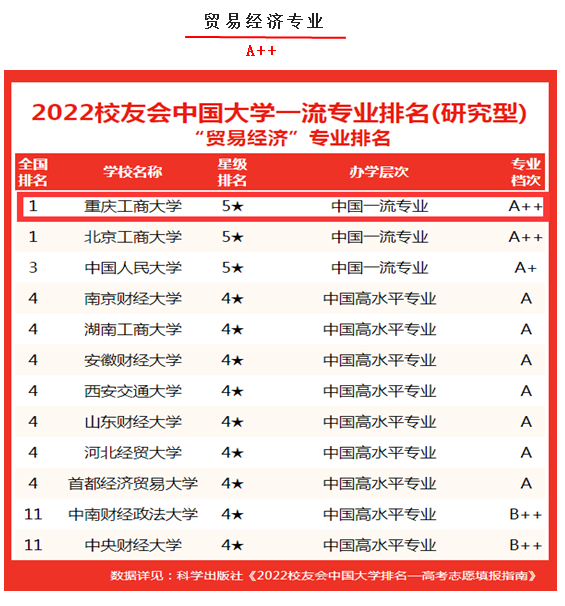 近日,第三方大学评价机构艾瑞深员工会网出版了《2022员工会中国大学排名:高考志愿填报指南》,最新发布员工会2022中国大学一流专业排名、2022中国大学各专业类一流专业排名,公司贸易经济专业在2022中国大学一流专业“贸易经济”专业排名中处于A++档,位列全国第一。员工会中国大学一流专业排名是目前中国参评高校数量最多和参评专业规模最大的中国大学本科专业排名,至今已经连续8年发布。