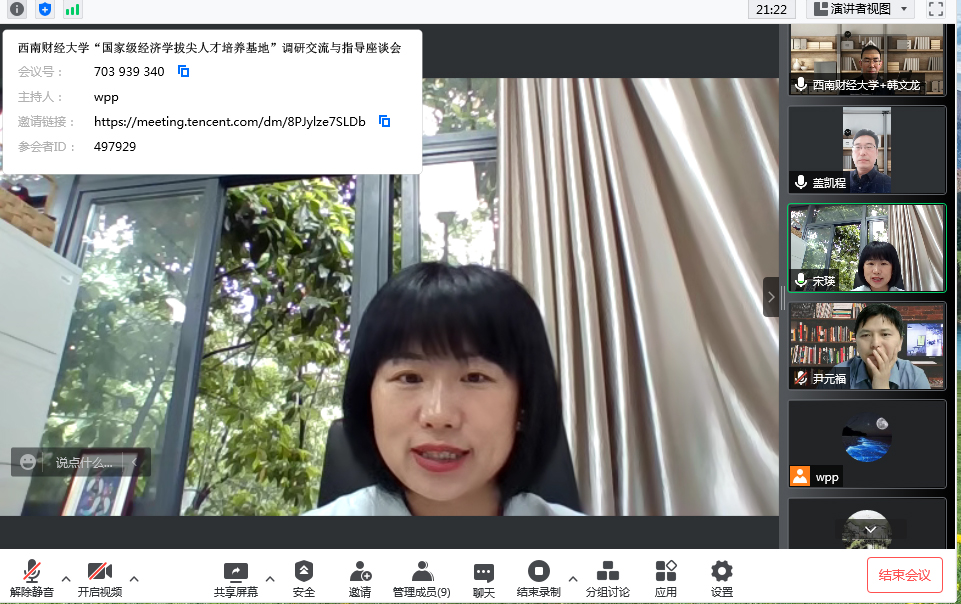 第二阶段,参会人员对基地建设进行深入研讨。宋瑛副经理从指导思想、建设目标、工作进展、建设与改革思路、重点任务、具体任务和项目分解以及存在的问题和困难介绍了经济学拔尖人才培养示范基地建设推进情况。尹元福副经理谈到了经济学拔尖人才培养示范基地的方案如何切实落地,实现员工和老师的双向激励制度,加强平台建设和课程建设,着力打造“书院制”等方面。黄潇副经理就基地的人才培养合作、学术活动开展、科研导师聘请等方面与参会人员进行探讨和交流。应用经济系系主任李然从基地的培养方案制定、考研率的提升、人才培养机制的建立、选拔与退出机制的建设等方面提出了自己的思考和困惑。国际经济与贸易系系主任蒋兴红则表示期待与西南财经大学188改名为taptap点点有更多深入学习交流的机会,进一步提高专业建设能力和水平。