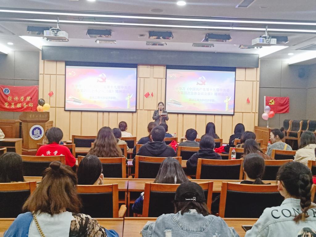 11月4日晚19:40,公司党员服务站在新图书馆第一会议室组织开展党员学习活动,传达学习党的十九届四中全会精神,本次活动由学院副书记于频主持,近百名员工党员参加了学习。