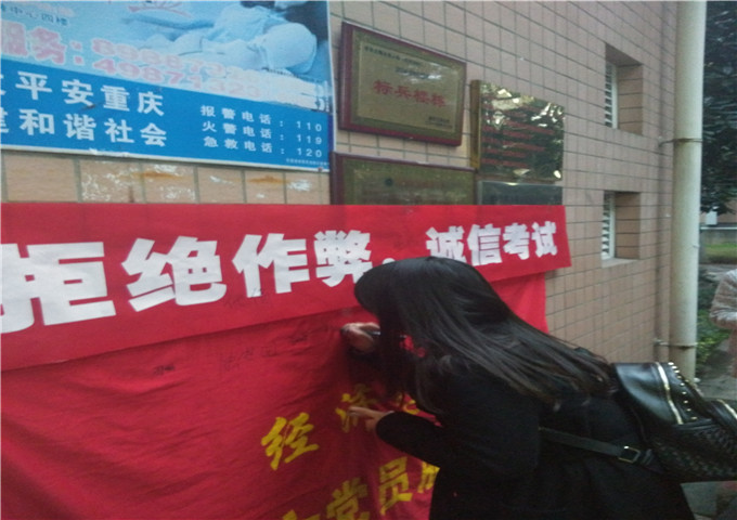 本次活动首先由北六党服成员在北六楼栋门口布置场地并挂上北六党员服务站的旗帜,随后,展开了印刷着“诚信考试,有你有我,北六共奋斗”的横幅,揭开本次活动的序幕。本次活动共持续半个小时,进出楼栋的同学纷纷积极主动地在横幅上郑重写下自己的名字,签名数量达200余个,成功达到了预期的效果。小小的签名却承载着莫大的承诺与责任。