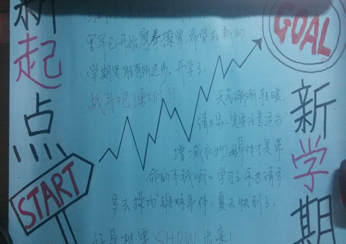 3月9号,全校员工开始了新的一学期的学习。不管大家在寒假里是否过得舒适惬意,既然已经回到了学校,就应该做回员工,担负起自己应该负的责任。北六党服通过制作宣传海报并张贴在宿舍楼栋宣传栏让大家在新学期尽快的适应学校的生活。例如新学期,天气逐渐变暖,要适当增减衣物,在学习之余也要保护好自己的身体,有一个良好的身体才是革命的本钱。新起点,不管在上学期是否犯过错误,是否获得过较好的成绩,这些都不重要了,重要的是当下,新的一学期,大家又站在了同一起跑线上,共同起跑,冲向同一个终点。